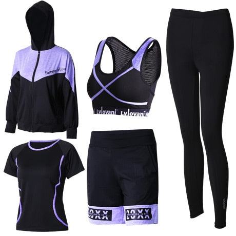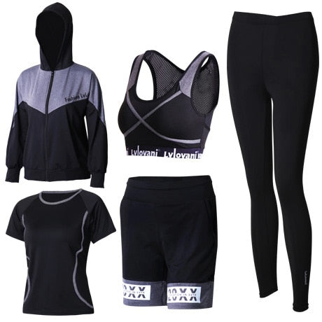 Women Sportswear: Bra+Pants+Shorts+Jacket+Shirt 5 Piece Set Plus Size